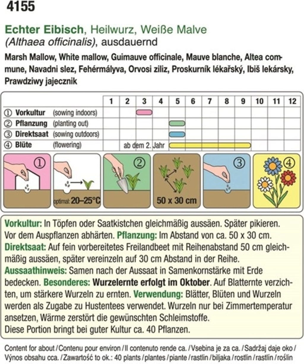 The common marshmallow only blooms in its second year. If you wish to harvest the roots, this is possible from October onwards. In addition to the roots, the leaves and flowers can also be used for tea preparation.