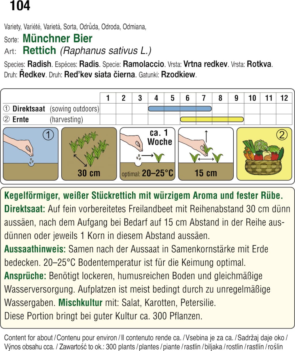 The "Munich Beer" radish shines in white and features a conical growth habit. With its spicy aroma, it is particularly popular for raw consumption and as an ingredient in salads.