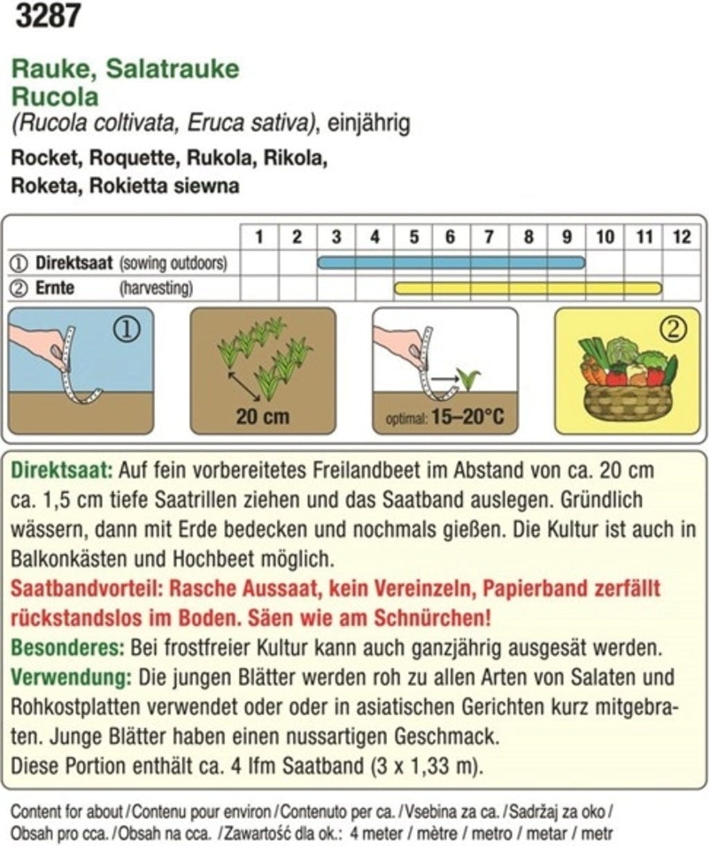 With the seed tape, the rocket is sown in no time and thinning out the seedlings is no longer necessary. The leaves have a nutty aroma and can be used for all types of salads and raw food dishes.