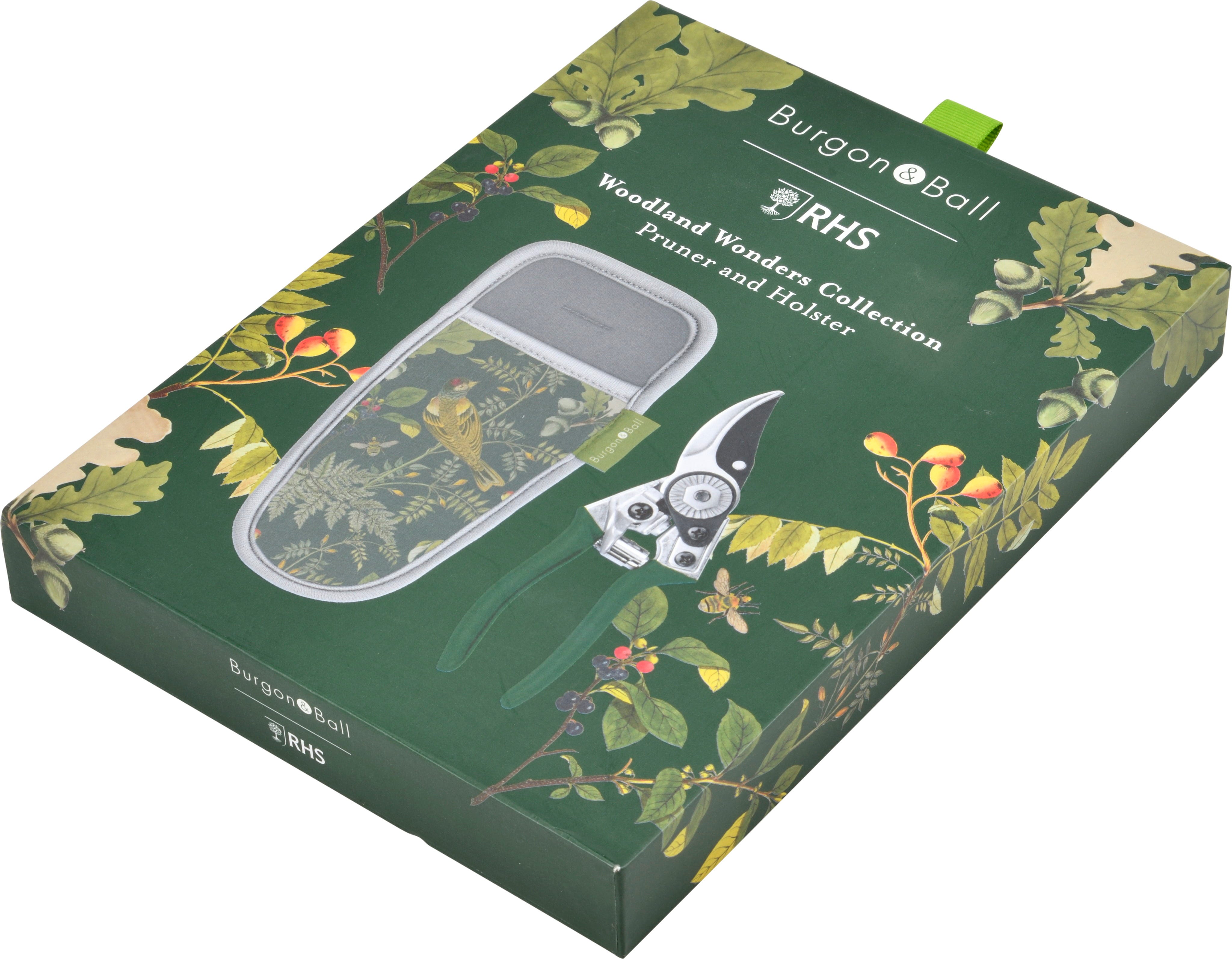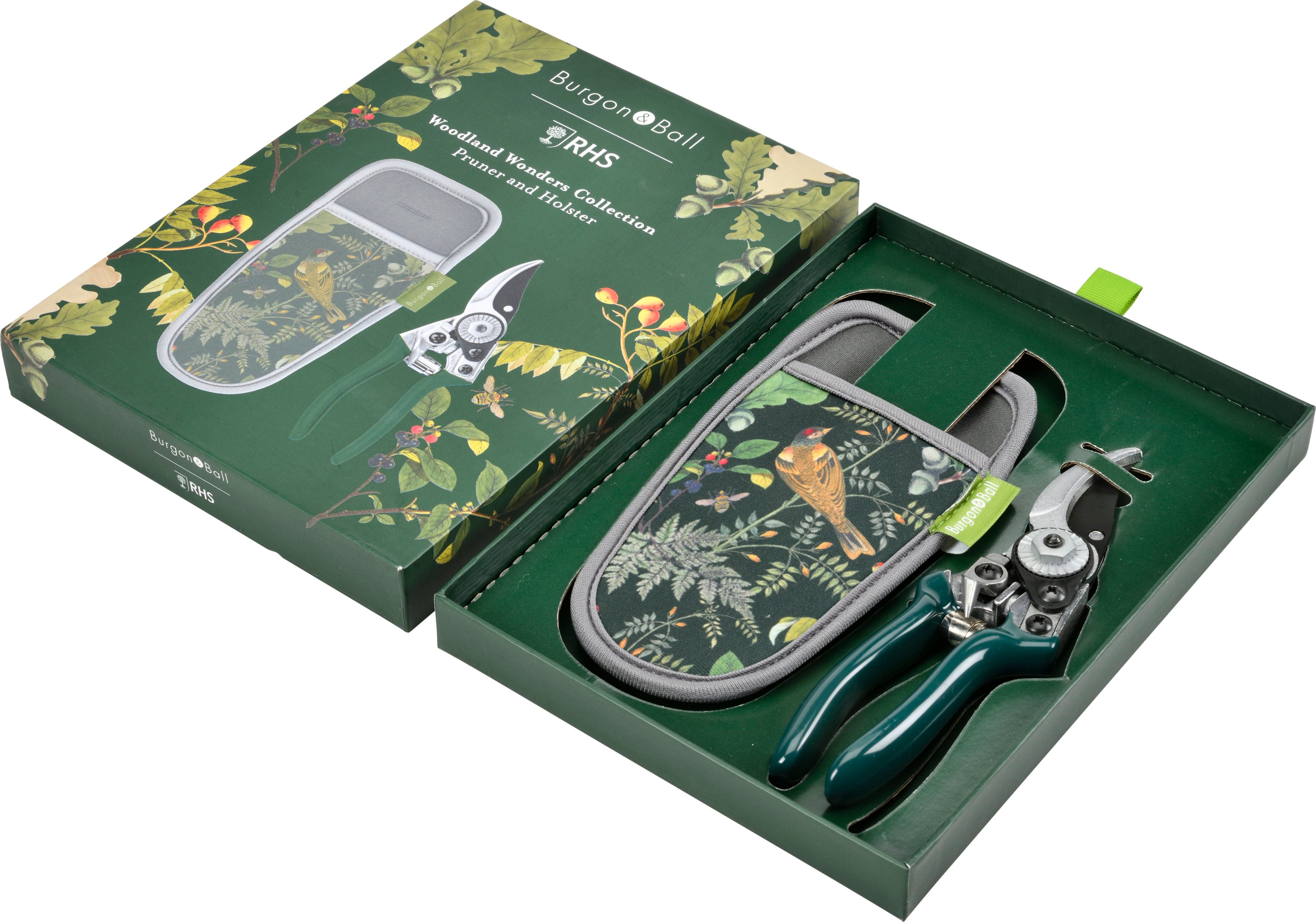 To ensure your pruner is always within reach as you move through the garden, the set includes a matching neoprene holster that can be easily attached to a belt. The design features historical illustrations from the RHS archives, radiating the tranquillity of the forest against a deep green backdrop.
