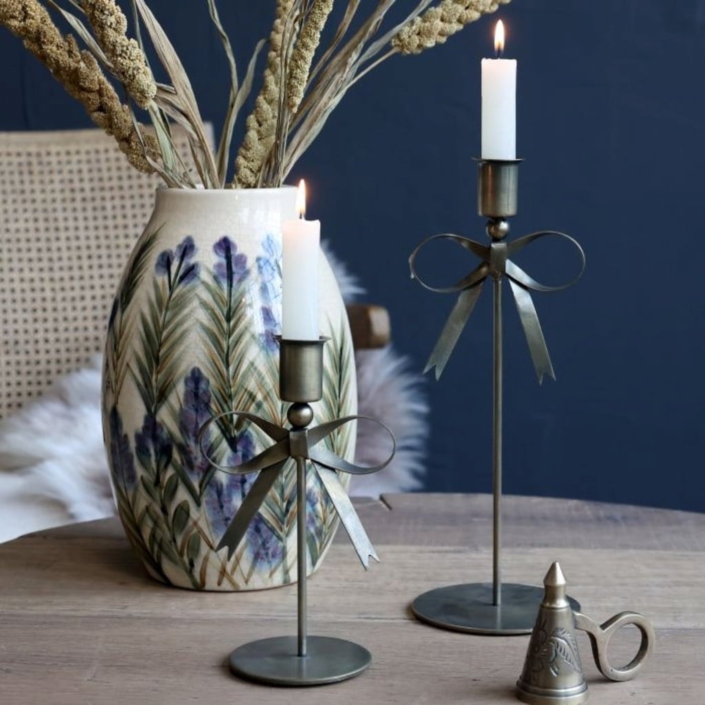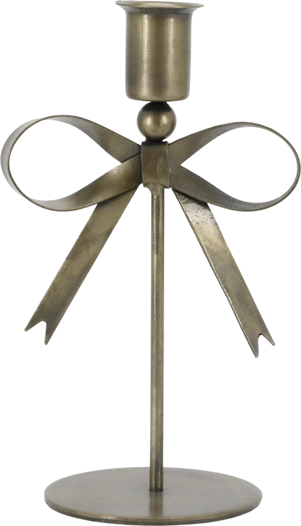 Add a warm, festive look to your home with this iron candlestick featuring an antique brass look. The playful bow on the stem of the candlestick gives it an elegant touch. Perfect for tapers and mini candles.