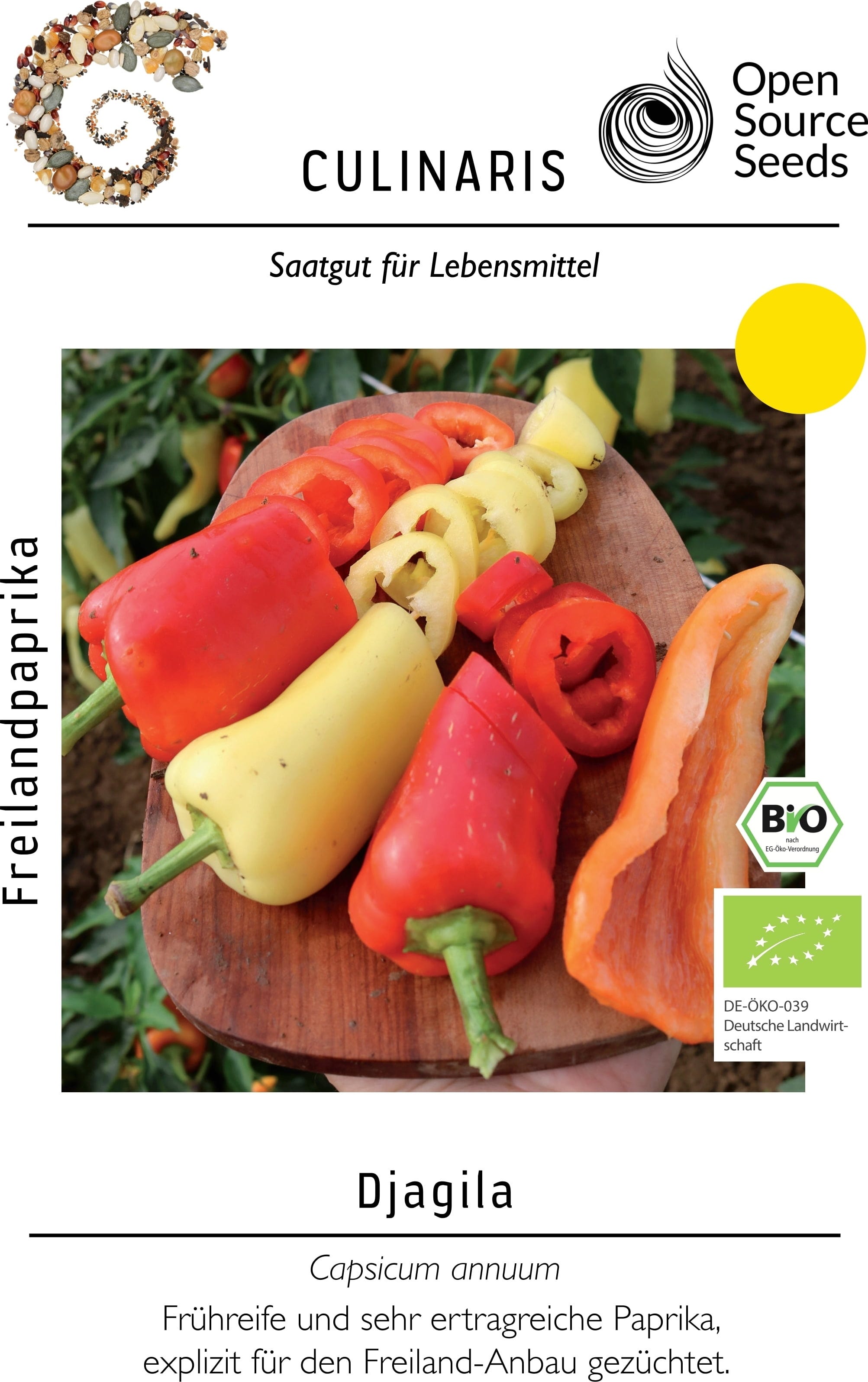 "Djagila" is an early-ripening, aromatic outdoor sweet pepper with large, pointed fruits. The plants are medium-sized, robust, and bear fruit continuously from July to November. Ideal for fresh consumption, canning, or processing into powder. Thanks to its Open Source license, the seeds can be freely shared and replanted.