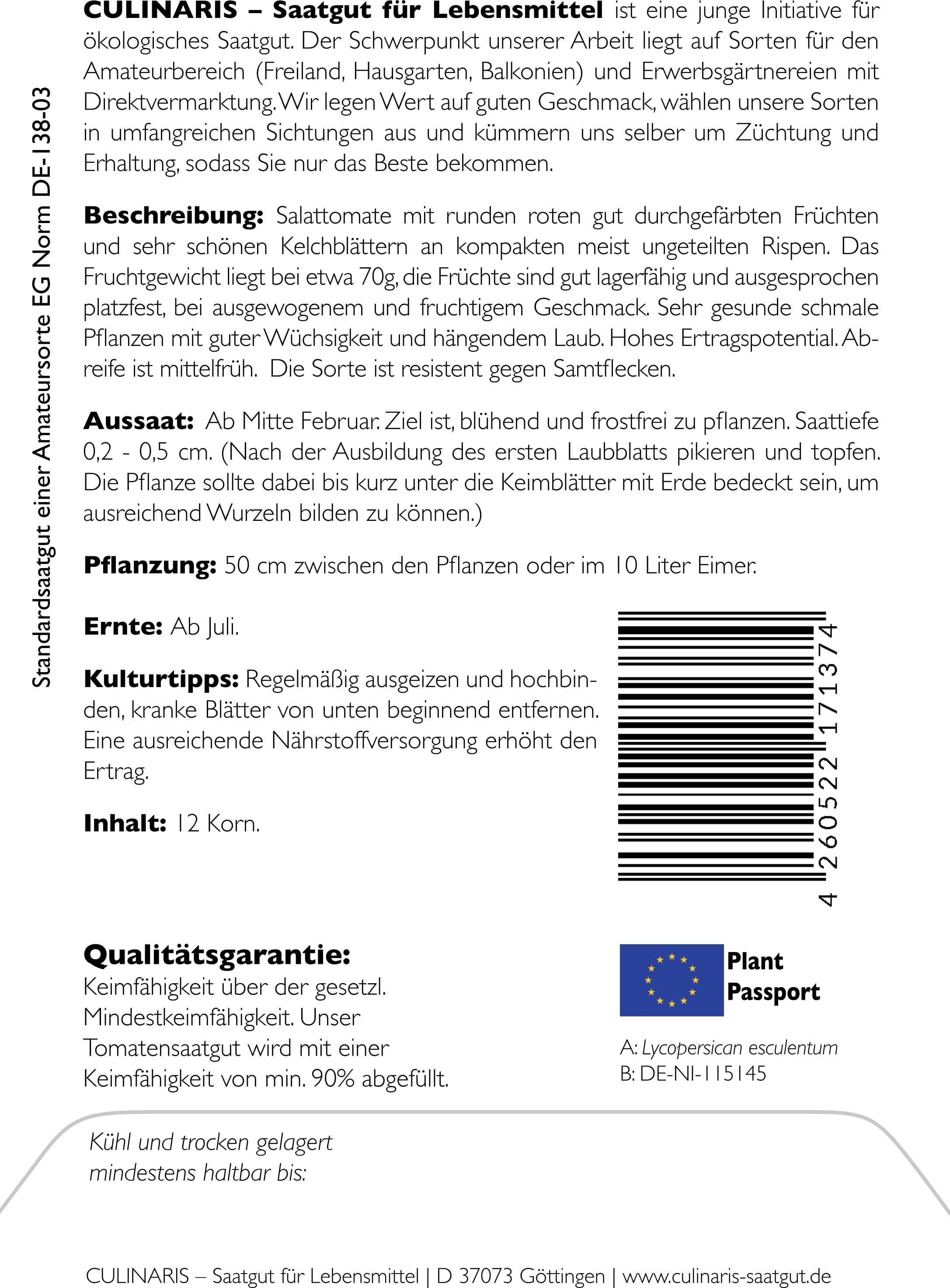 | Manufacturer: | Culinaris - Saatgut für Lebensmittel, Thiegasse 5, 37124, Rosdorf, Germany, info@culinaris-saatgut.de, culinaris-saatgut.de |