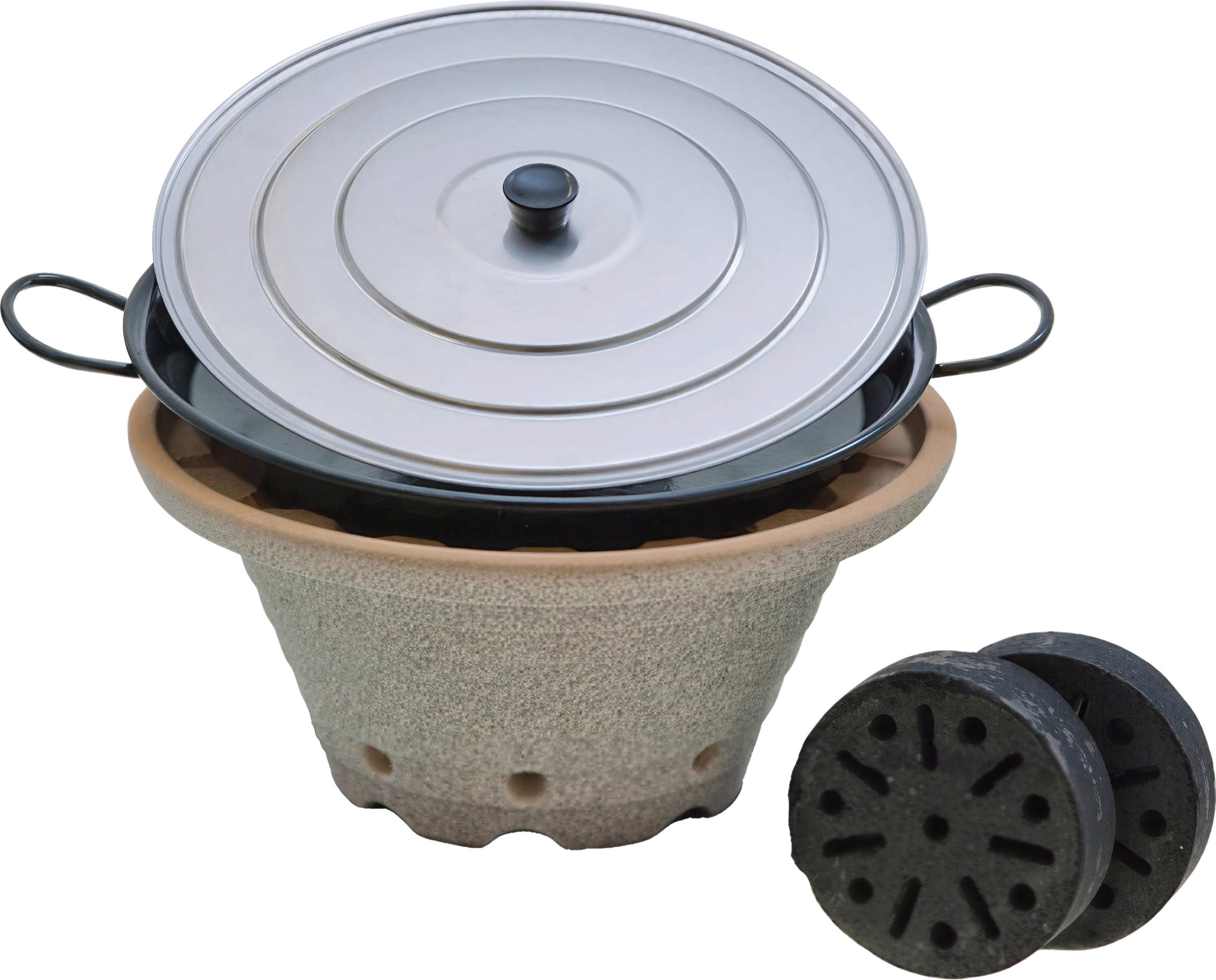 Included in the box: CosyRoast CeraFlam® brazier Granicium® coating, enamelled steel frying pan, aluminium lid, stainless steel ash grate, 2x quick-light briquettes