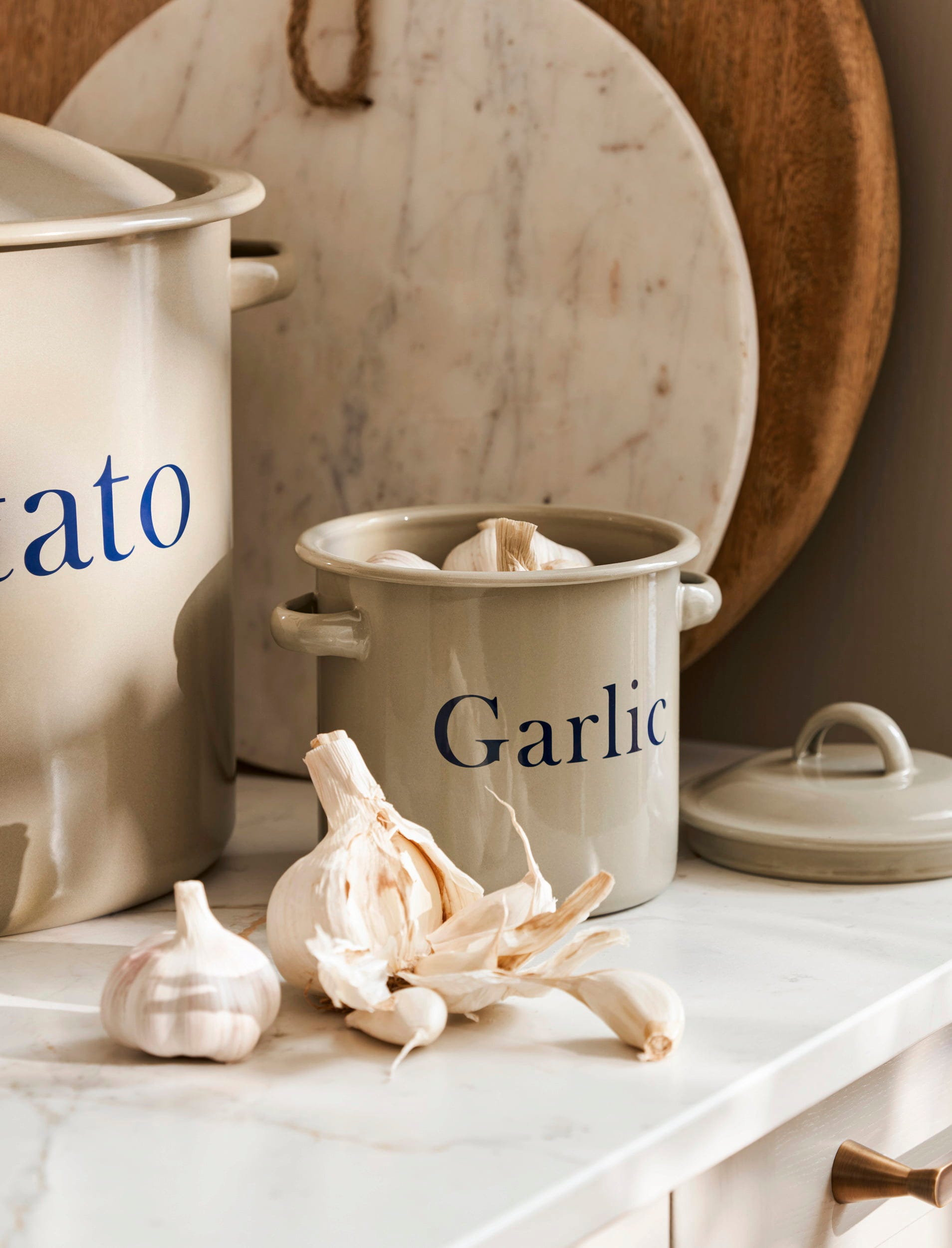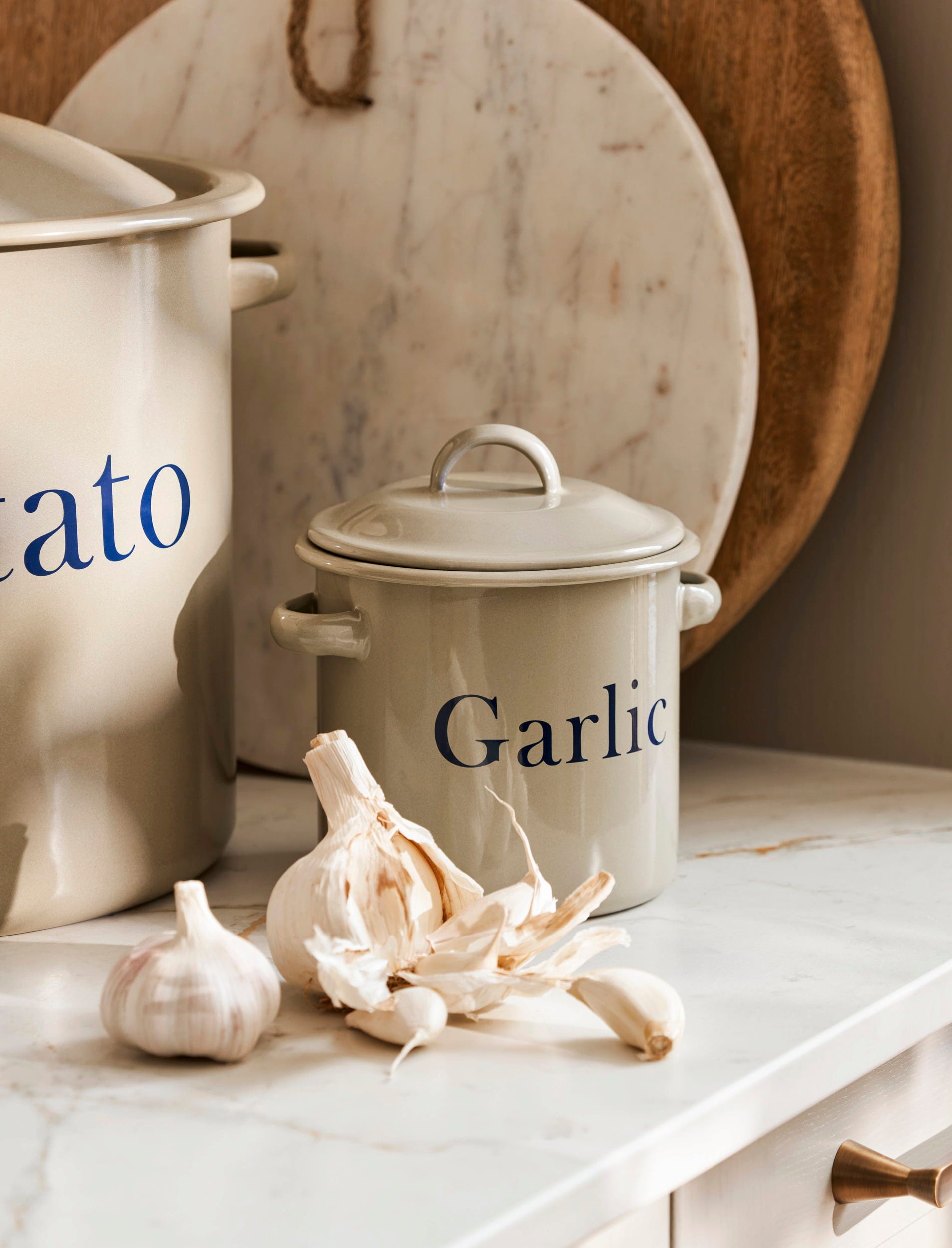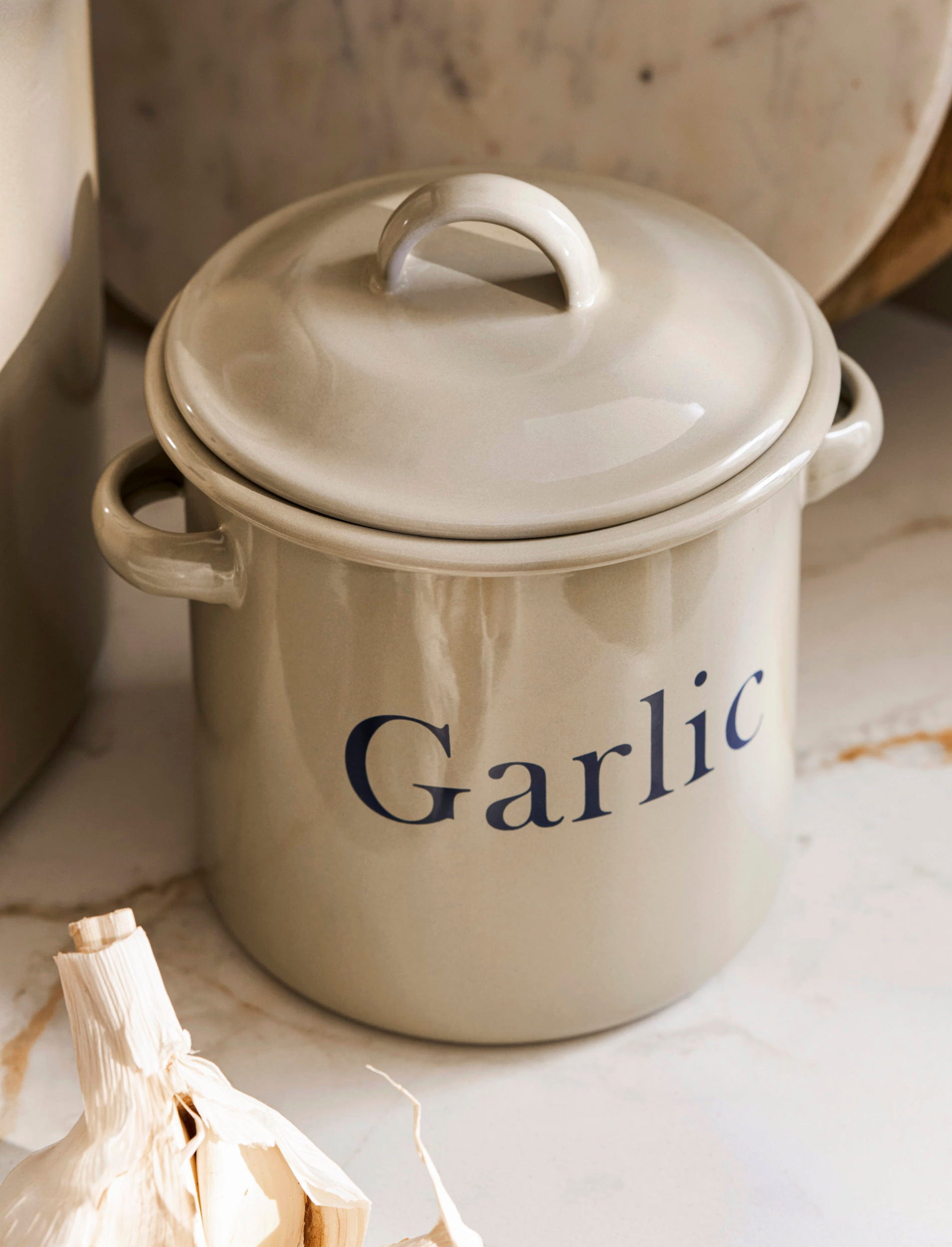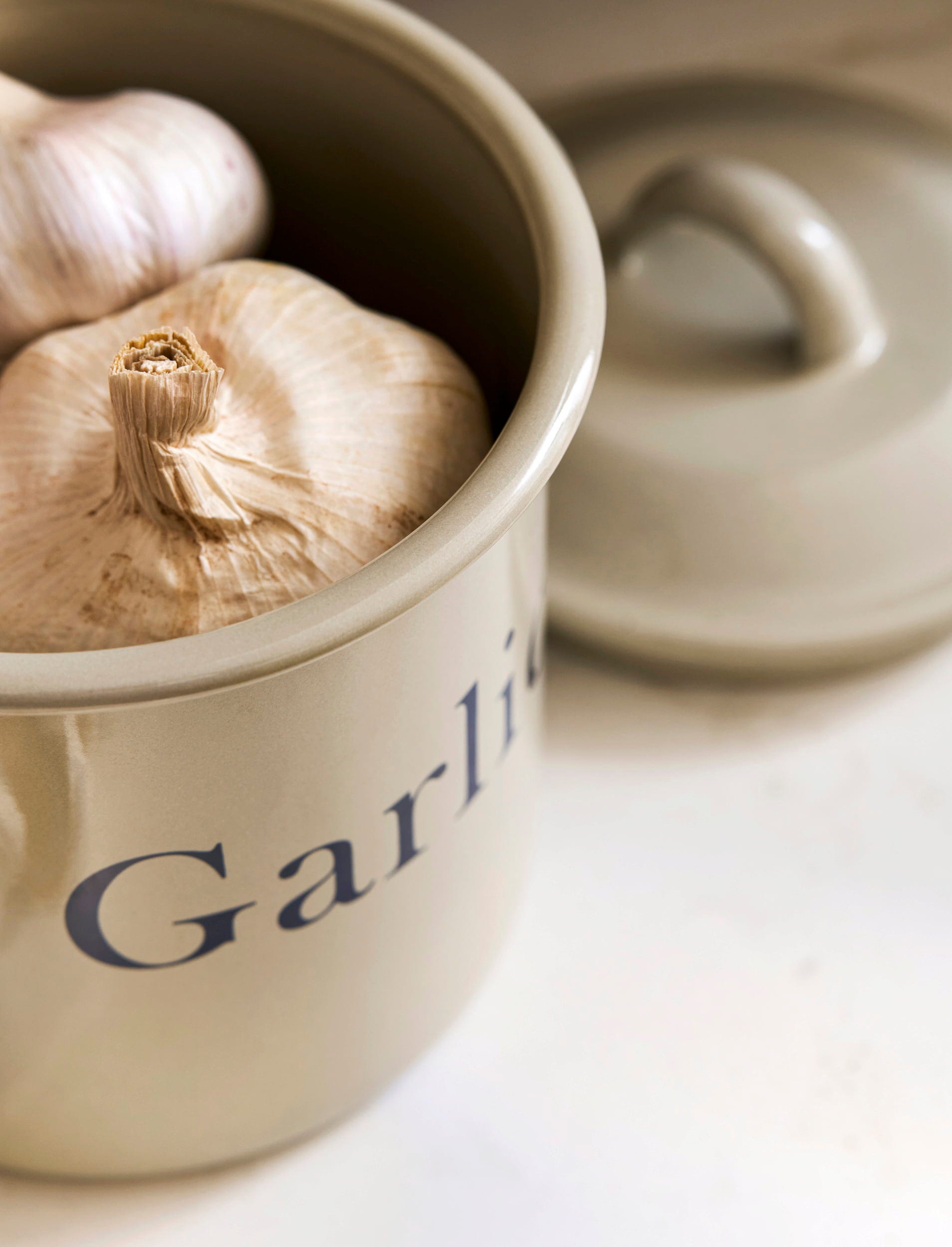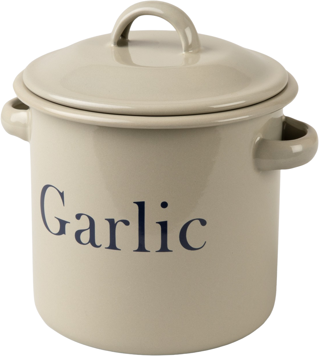 This enamel garlic pot is a stylish way to store garlic and an attractive addition to any kitchen shelf, pantry, or farmhouse-style countertop. Equipped with a lid and two handles, this container comes in a classic design in a warm "Truffle" shade. It offers ample space for whole garlic bulbs as well as individual cloves, ensuring they stay fresh for longer. It is an especially aesthetic way to bring order to your larder.