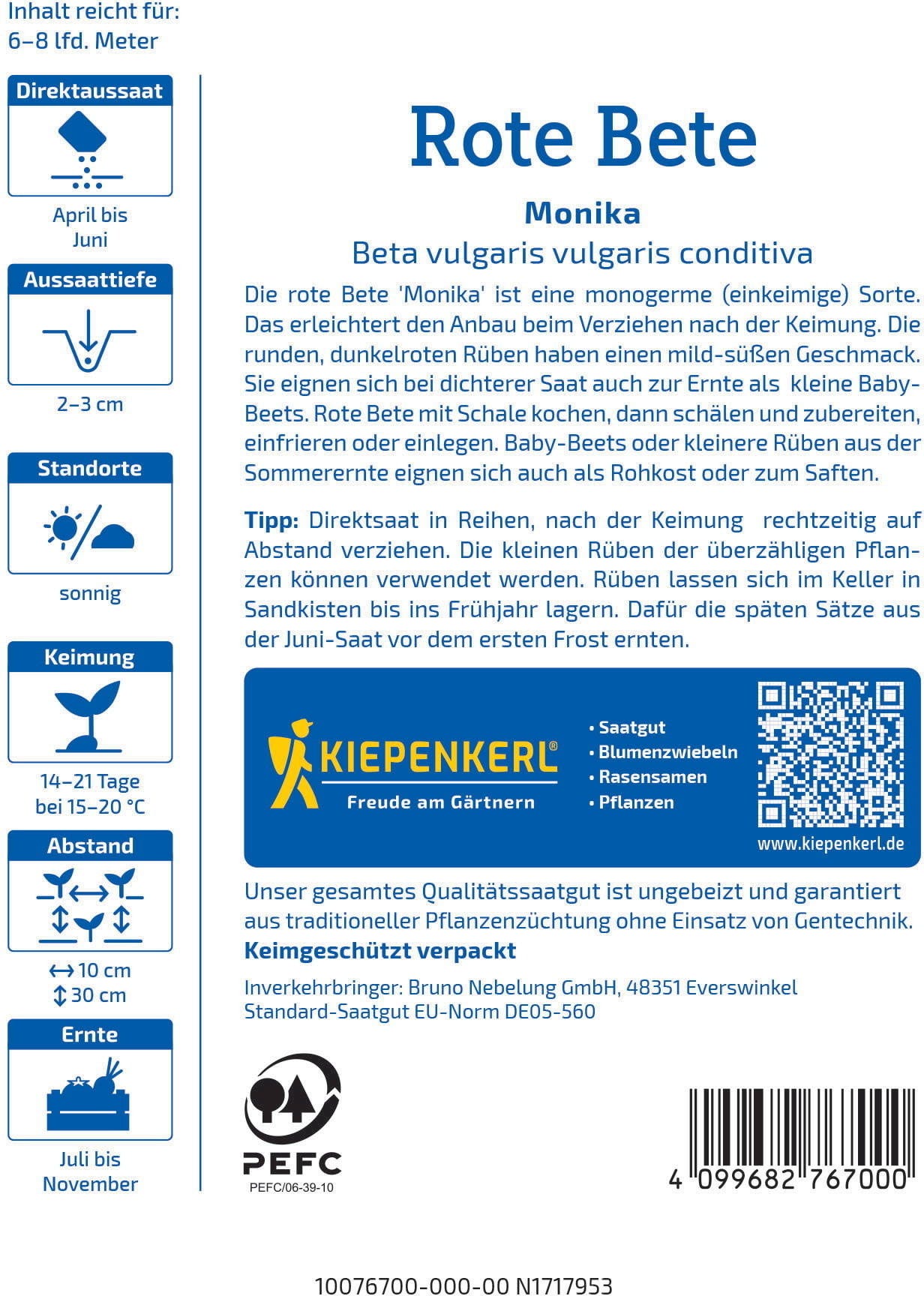 ‘Monika’ is a trusted beetroot variety in Austrian gardens, valued for its mildly sweet flavour and attractive, uniform roots. Its single-germ seeds make cultivation especially straightforward, making it ideal for beginners as well as experienced home gardeners. Harvested young as tender baby beet or left to mature for use in hot and cold dishes alike, ‘Monika’ is a versatile addition to any vegetable bed.