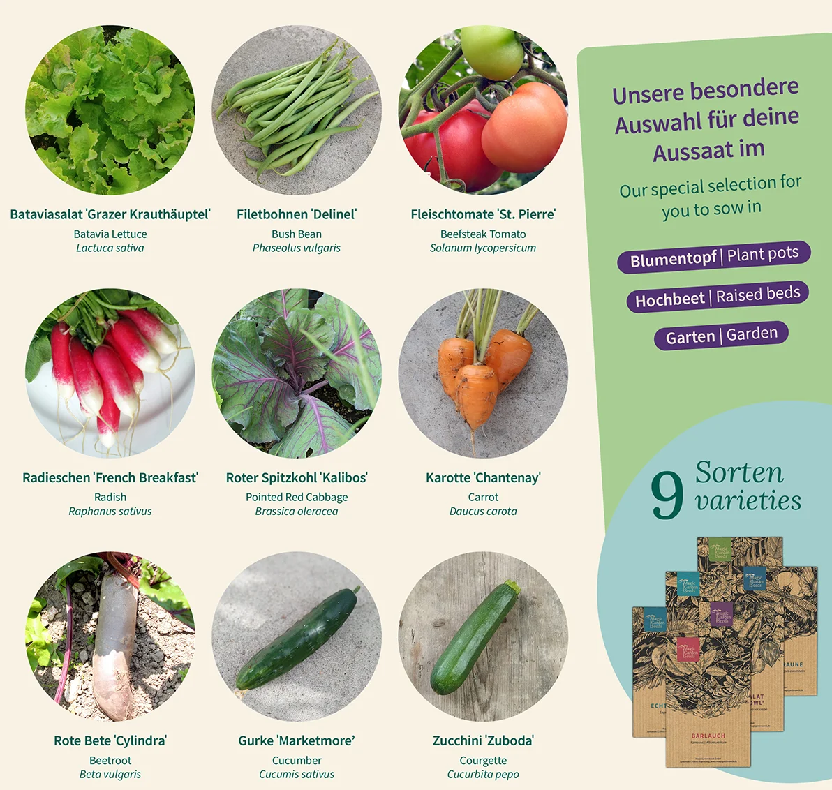 This seed set contains nine of the most popular vegetable varieties, allowing you to bring vibrant diversity to your garden or balcony. It's the perfect way to make your next summer especially delicious.