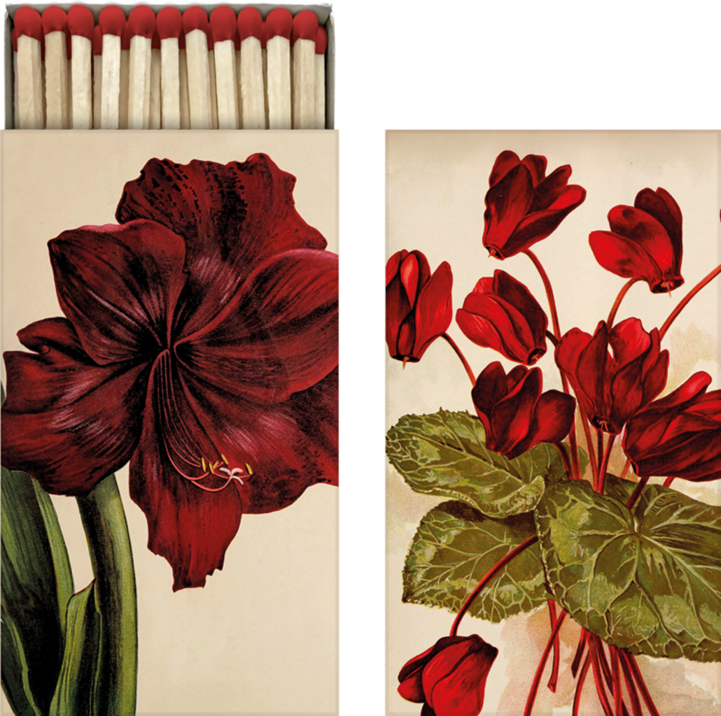 Matches in a decorative matchbox featuring a beautiful illustration of amaryllis blooms