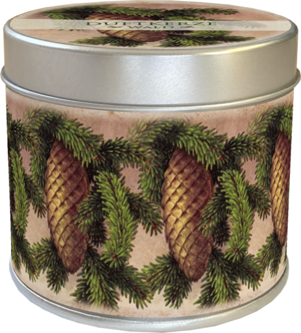 This soy wax candle with balsamic fir notes creates an atmospheric Christmas atmosphere. The design is inspired by vintage style and depicts a garland of pine branches and pine cones.