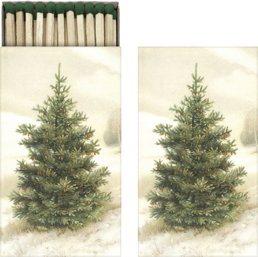 Matches in a decorative matchbox featuring a beautiful fir tree