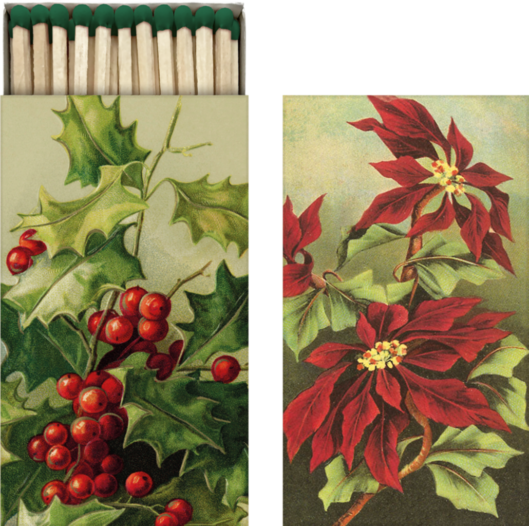 Matches in a decorative matchbox featuring a beautiful illustration of holly