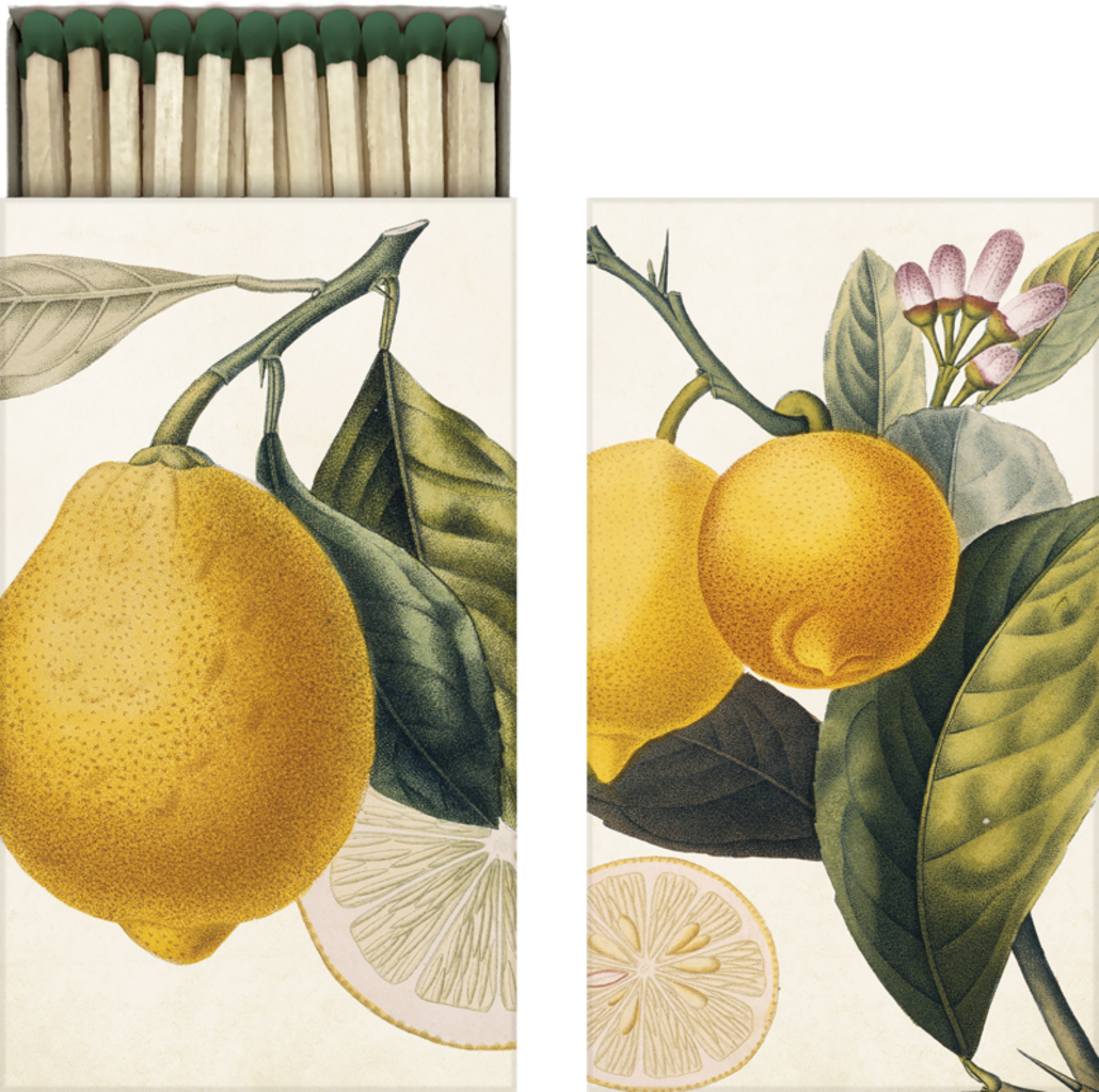 Matches in a decorative matchbox featuring a beautiful illustration of lemons